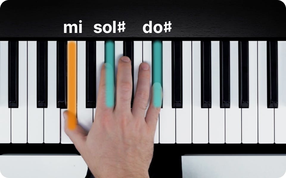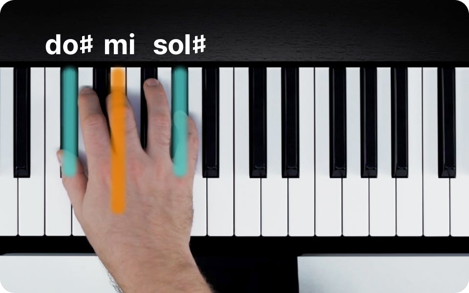 L’accord de Do ♯ mineur est composé des trois notes suivantes : Do ♯, Mi et Sol ♯ Pour jouer l’accord avec la main droite, utilisez les doigtés suivants :