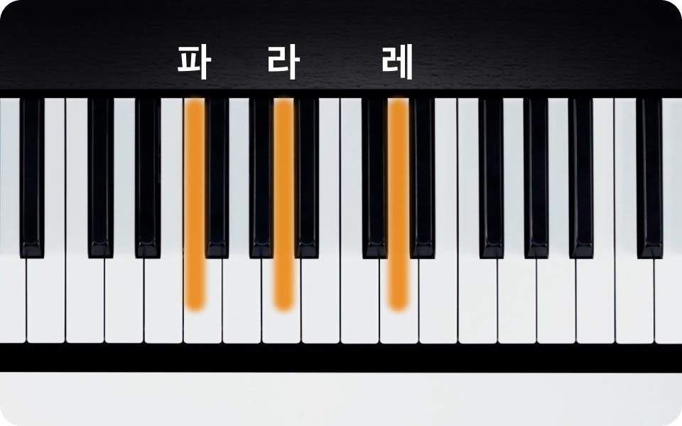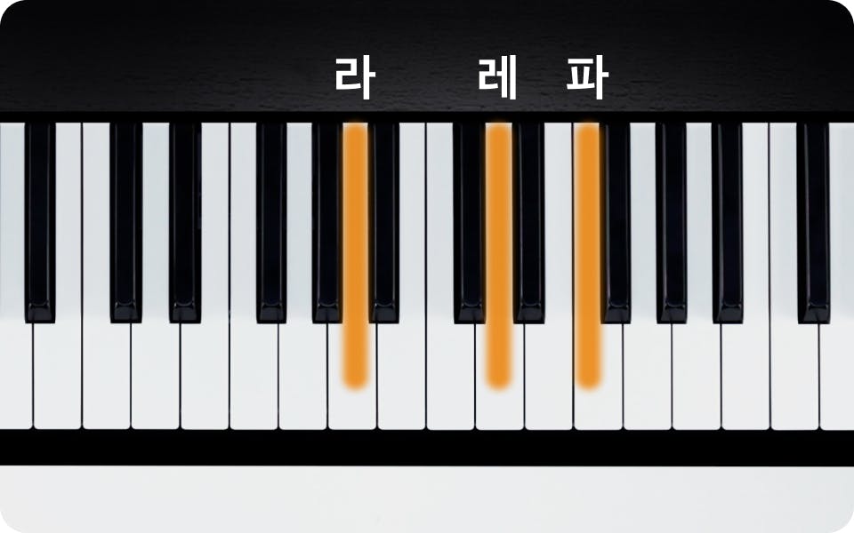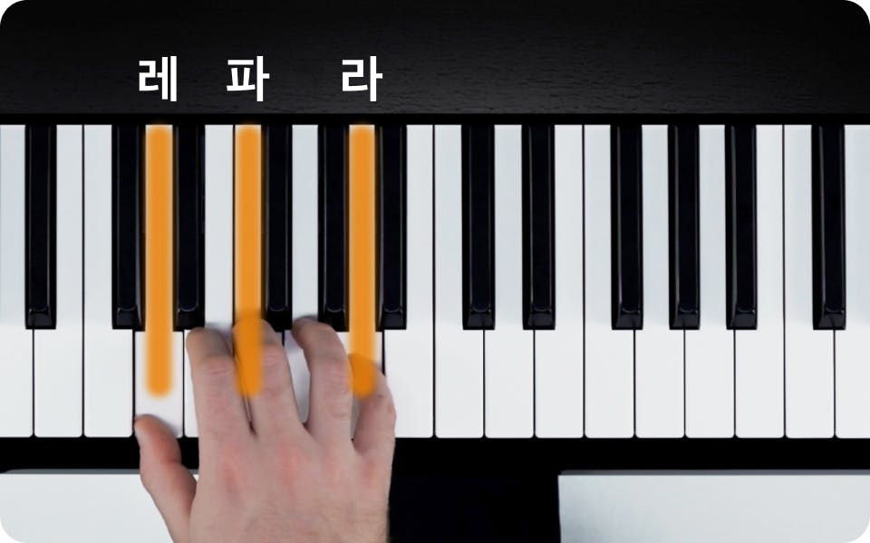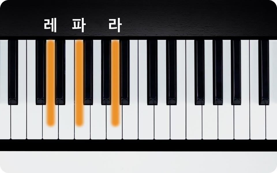 D 마이너 코드는 흰 건반으로만 이루어진 마이너 코드 중 하나로 여러 음악에서 자주 사용되는 코드입니다. 우선 근음인 레(D)를 찾아봅시다. 피아노에서 두 개씩 묶인 검은 건반을 찾아보세요. 이 두 검은 건반 사이에 있는 흰 건반이 바로 레입니다.