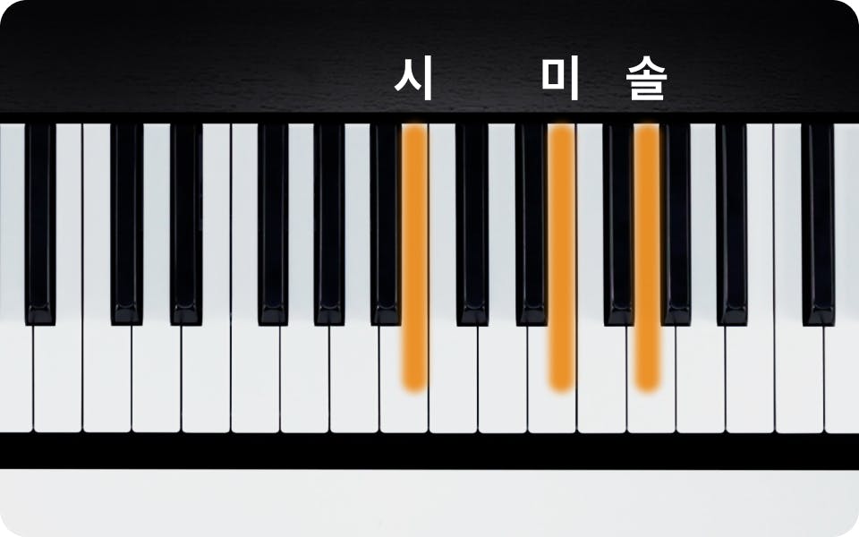 E 마이너 코드는 근음 (미), 단3도 (솔), 그리고 완전5도 (시)로 이루어진 3화음입니다.