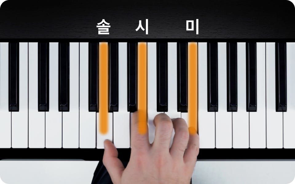 E 마이너의 제1전위에서는 가장 낮은 음이 솔(G)입니다. 이를 오른손으로 연주할 때 사용하는 손가락은 다음과 같습니다.
