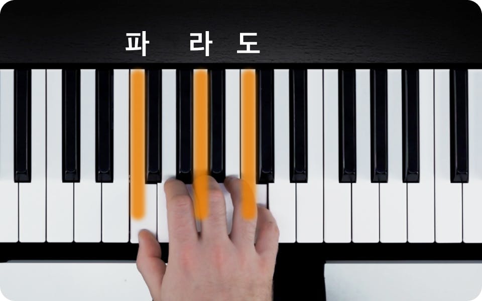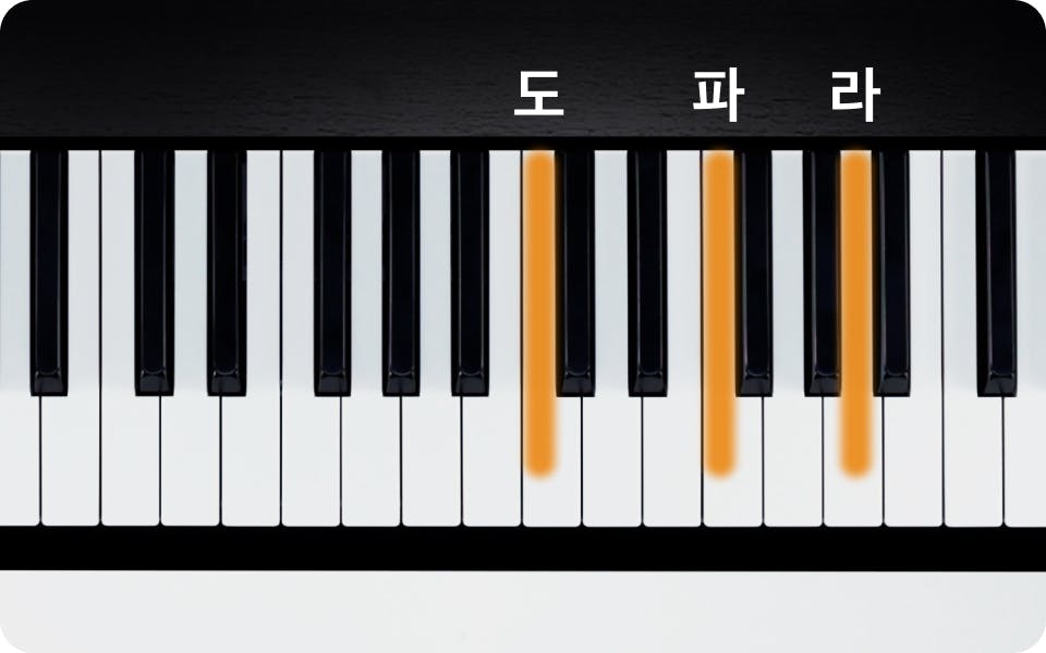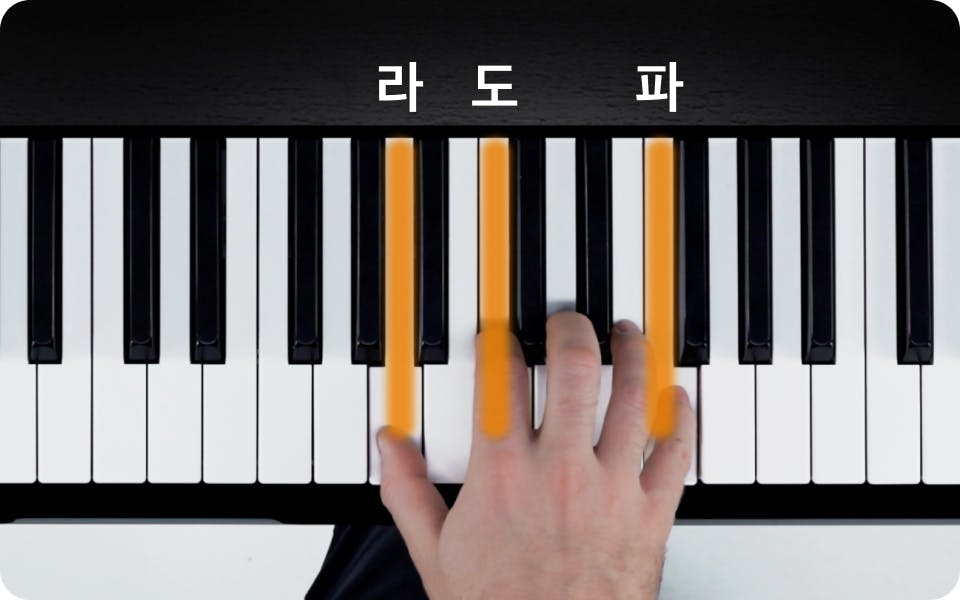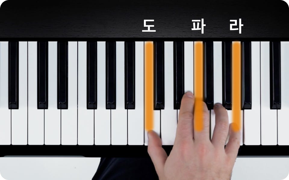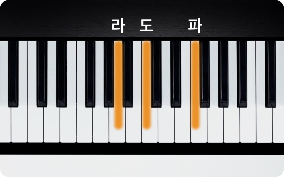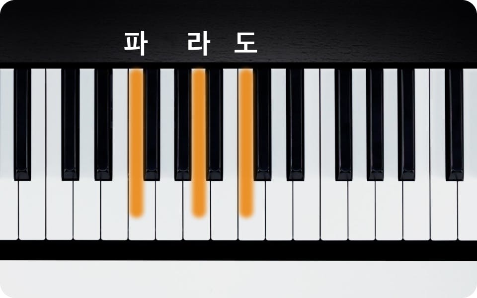 F 메이저 코드의 근음은 파(F)입니다. 이를 건반 위에서 찾으려면, 우선 세 개씩 묶인 검은 건반을 주목하세요. 이 중 가장 왼쪽 검은 건반의 바로 왼쪽에 붙어 있는 흰 건반이 파입니다. 여기서부터 코드를 쌓아올려 보겠습니다.