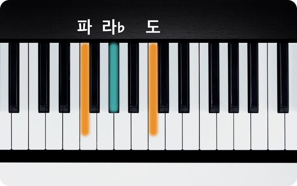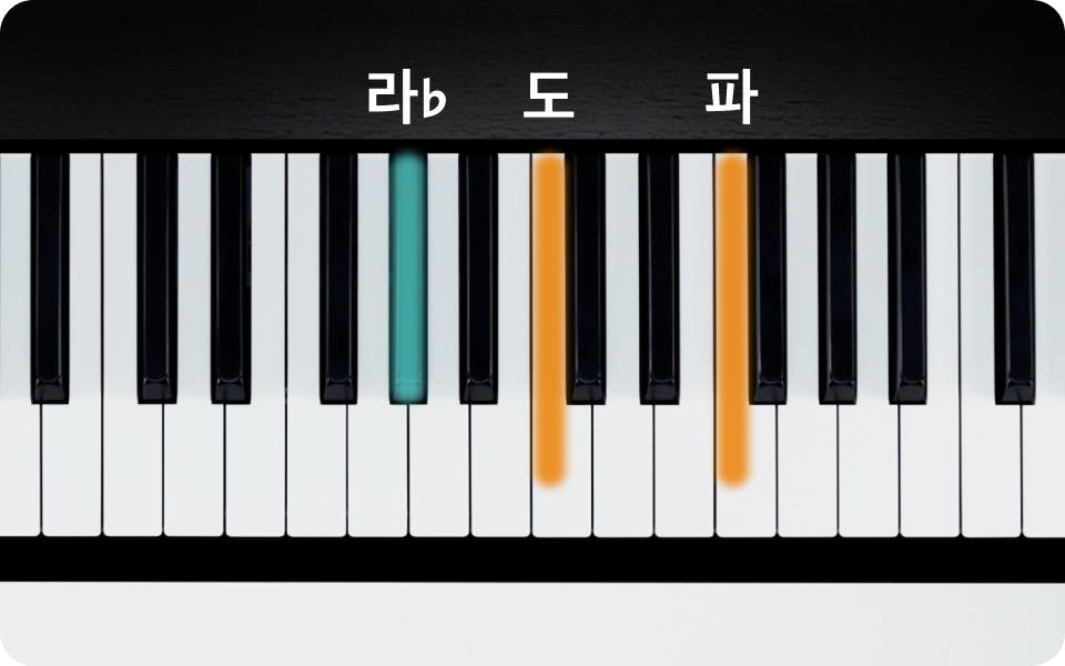 F 마이너 코드의 근음은 파(F)입니다. 이를 건반 위에서 찾으려면, 우선 세 개씩 묶인 검은 건반을 주목하세요. 이 중 가장 왼쪽 검은 건반의 바로 왼쪽에 붙어 있는 흰 건반이 파입니다. 여기서부터 코드를 쌓아올려 보겠습니다.