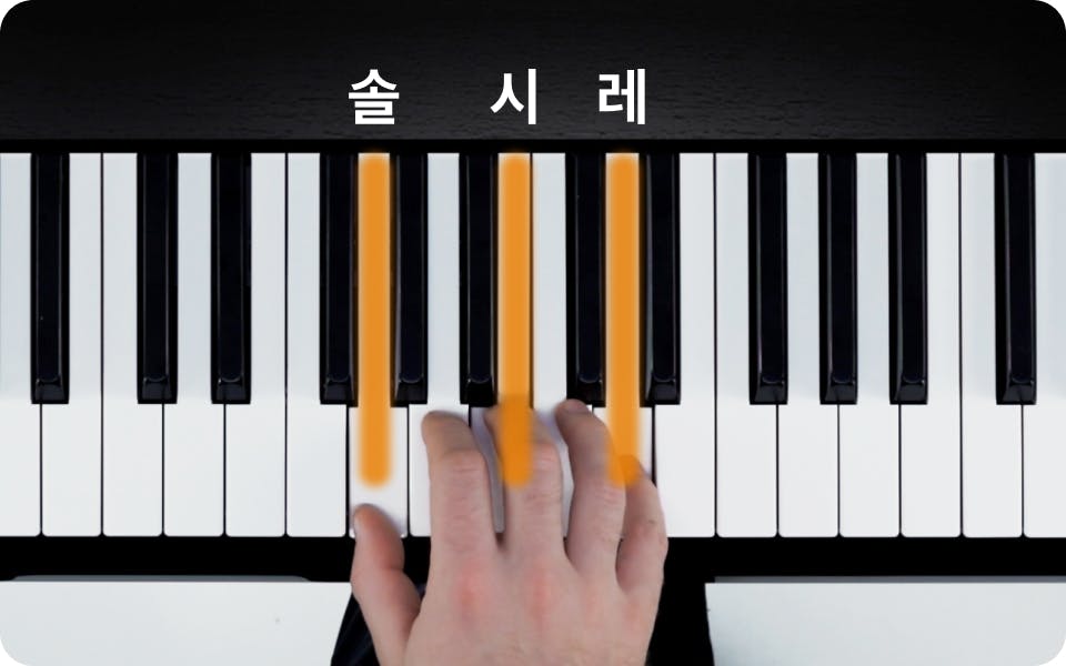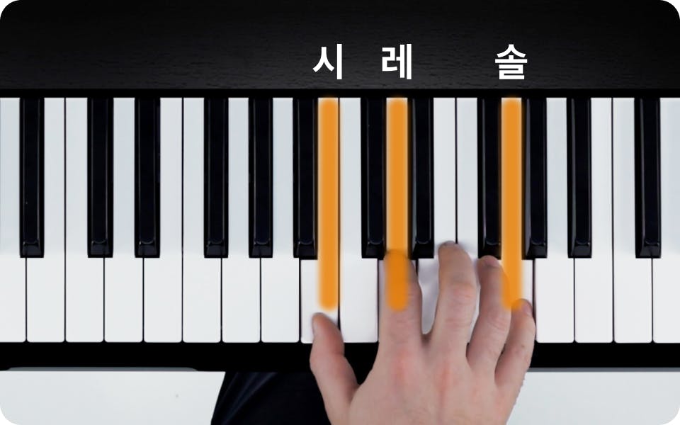 G 메이저의 제1전위에서는 시(B)를 베이스로 연주합니다. 이를 오른손으로 연주할 때 사용하는 손가락은 다음과 같습니다.