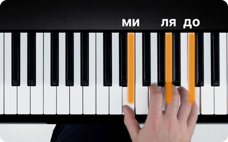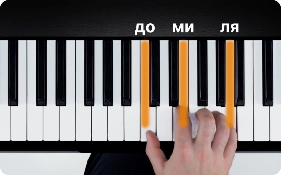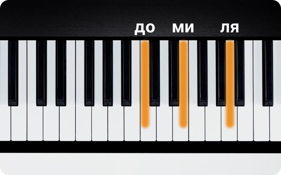 Аккорд состоит из следующих нот: ля, до и ми. Чтобы сыграть основной аккорд правой рукой, используйте следующие пальцы: