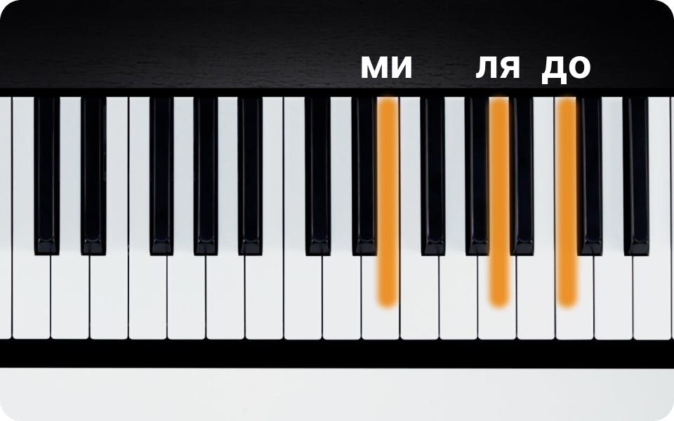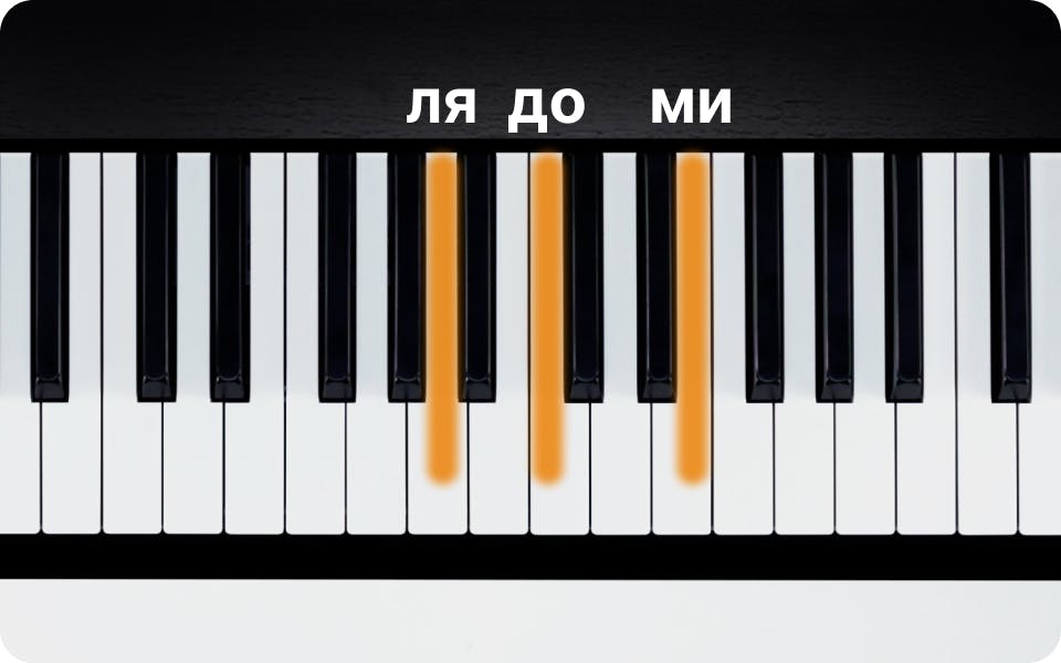 Аккорд ля минор не требует игры на черных клавишах, что отлично подойдет для начинающих. Чтобы найти основной тон аккорда, взгляните на группу из трех черных клавиш. Белая клавиша между второй и третьей черными клавишами — это и есть нота ля, основной тон аккорда ля минор.