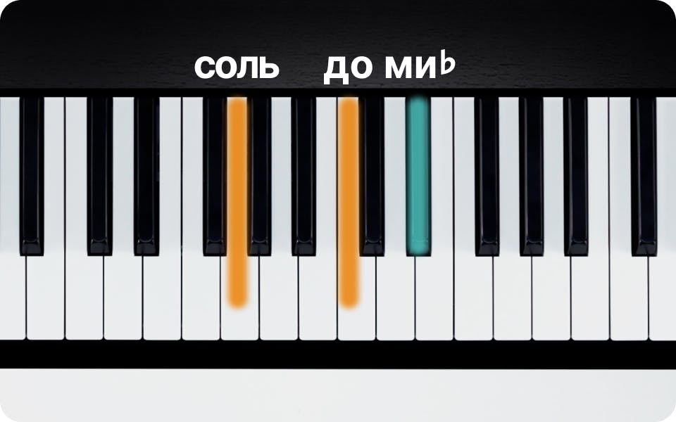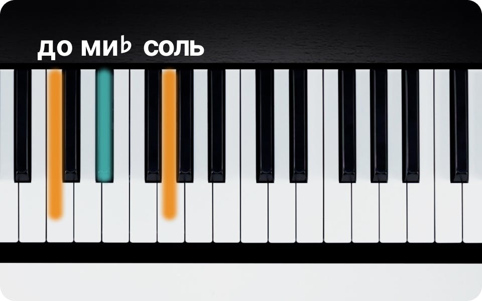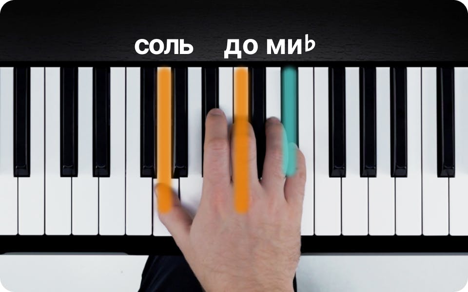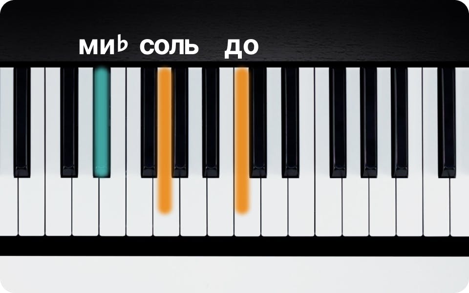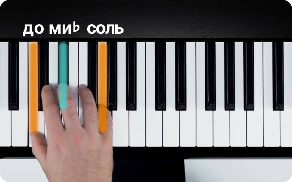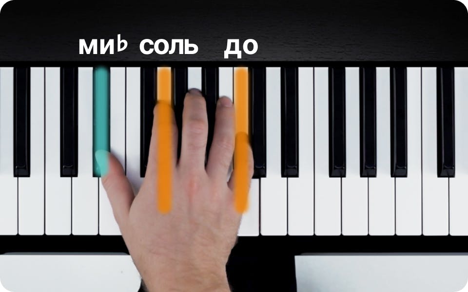 Аккорд до минор состоит из трех нот: до, ми♭ и соль. Чтобы сыграть основной аккорд правой рукой, используйте следующие пальцы: