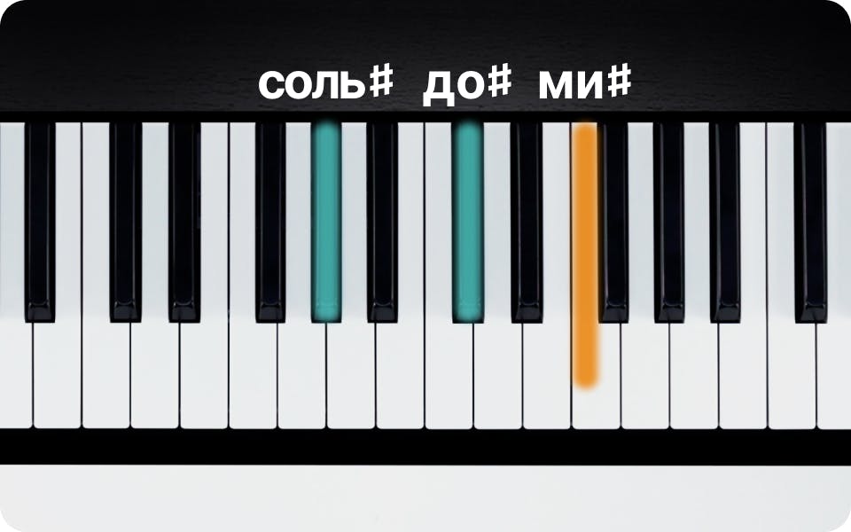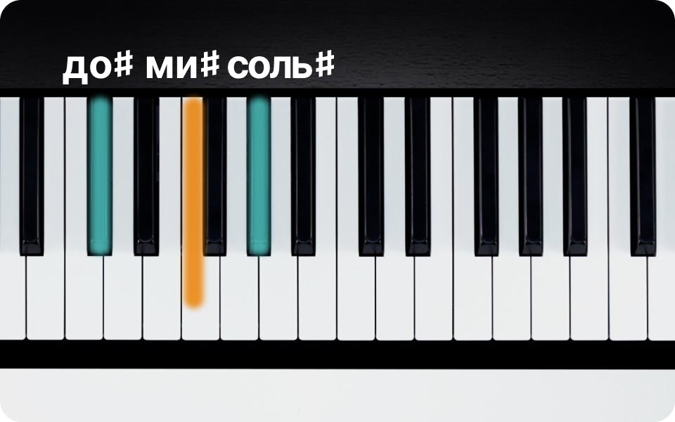 Чтобы сыграть аккорд до♯ мажор, нужно найти его основной тон — до♯. Обратите внимание на группу из двух черных клавиш и положите палец на самую левую — между до и ре. Начиная с нее вы готовы строить аккорд.