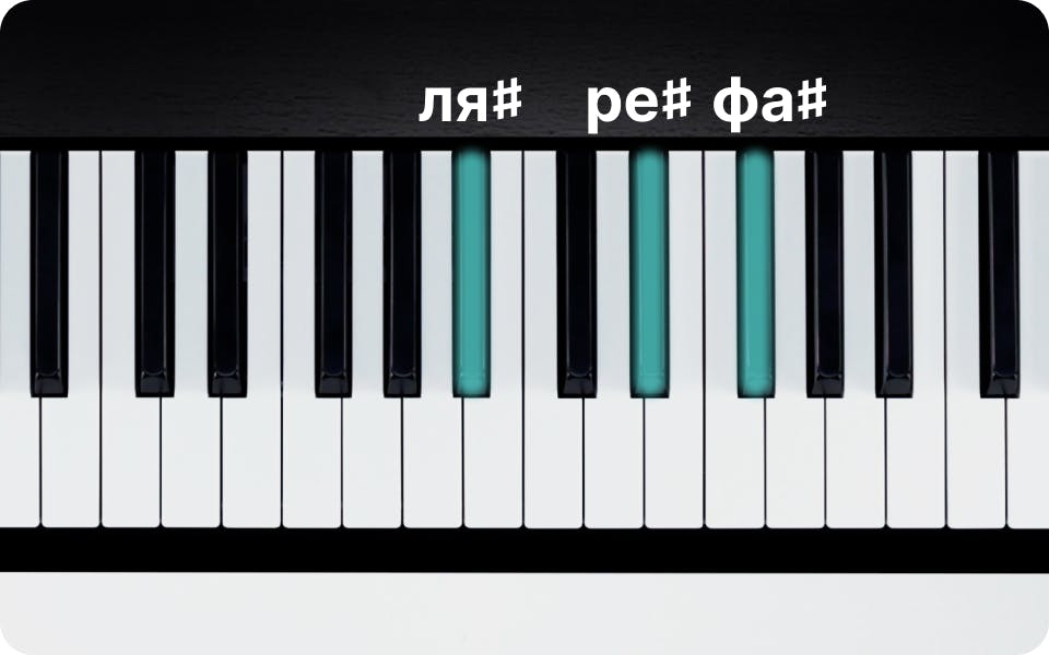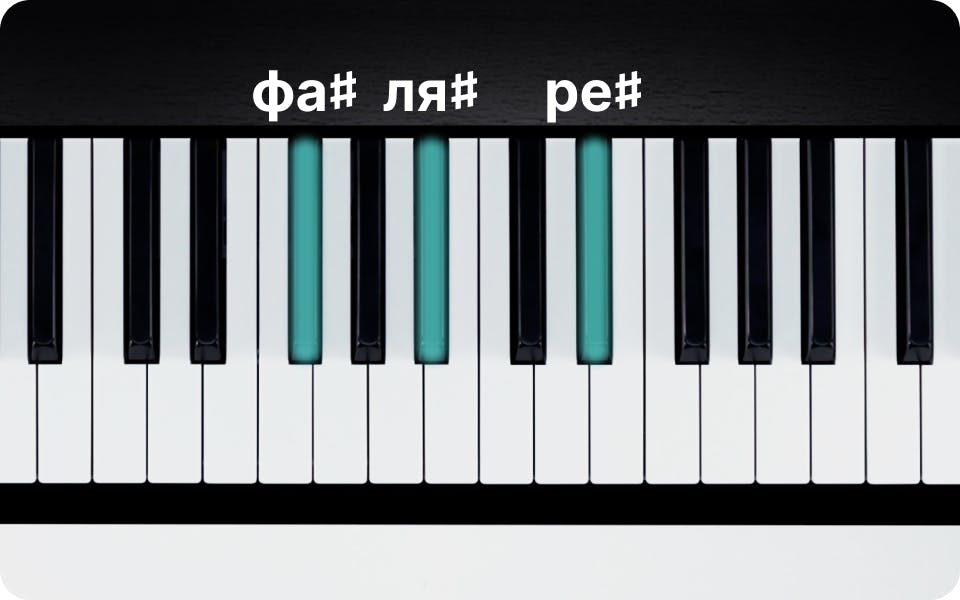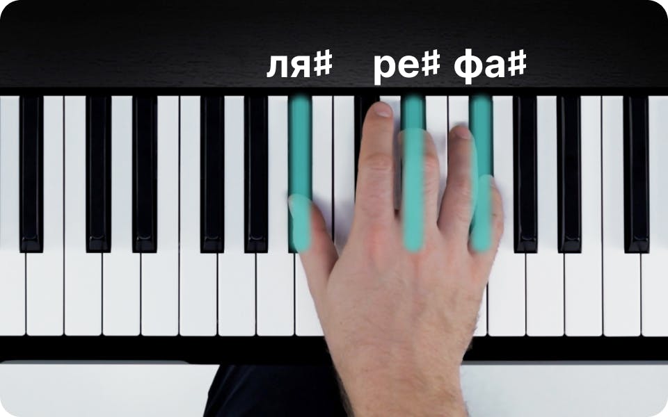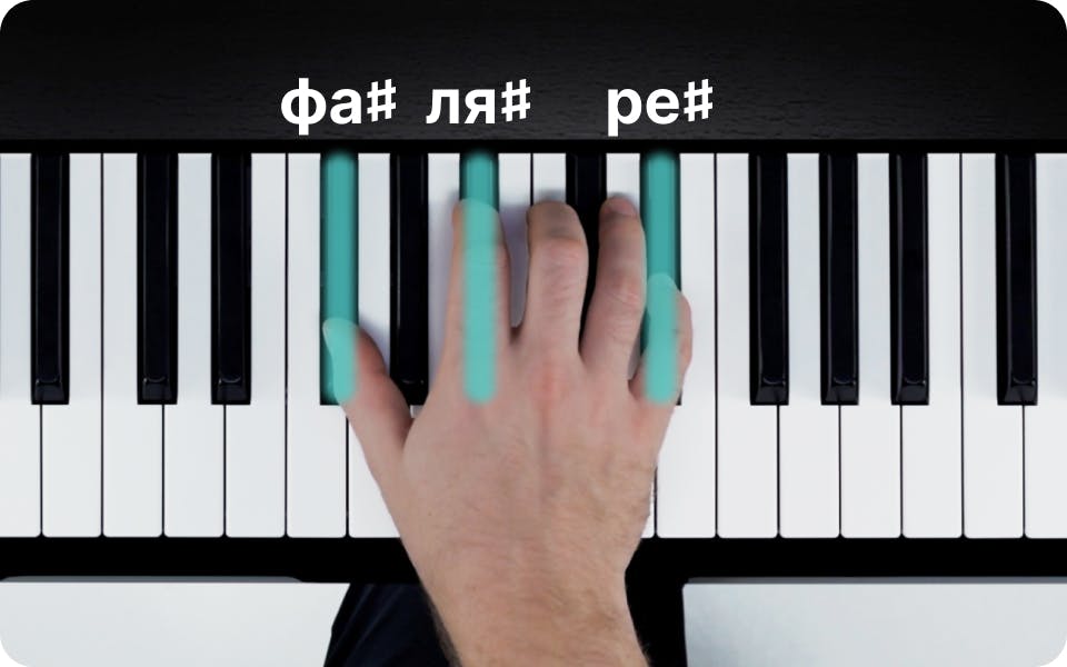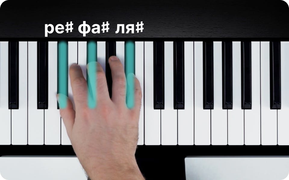 Аккорд ре♯ минор состоит из следующих нот: ре♯, фа♯ и ля♯. Постановка пальцев правой руки будет следующей: